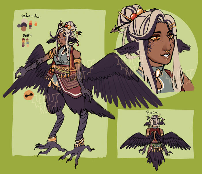 • Reference sheets include a flat fullbody + flat headshot, alongside close-ups of additional clothing details.